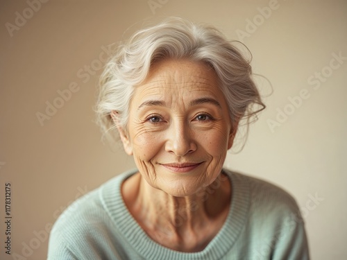 a warm and gentle elderly woman with a soft, comforting smile, wearing elegant and well-coordinated clothing, perhaps a flowy dress or a blouse with a skirt