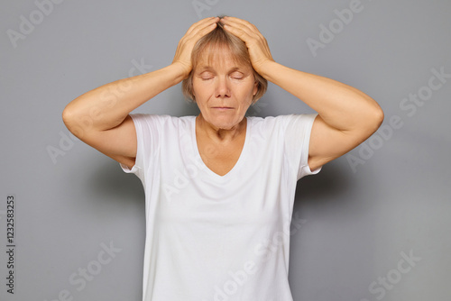 A woman appears to be overwhelmed or stressed, with her eyes closed and hands placed on her head. The neutral gray background emphasizes her expression of feeling burdened or anxious