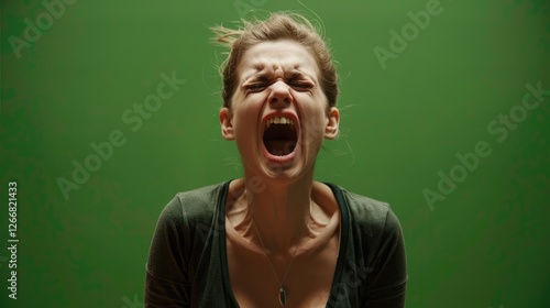 A woman expressing intense emotion against a green background, conveying feelings of anger or frustration