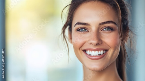 A woman, her hair pulled back, exuded confidence and a radiant smile, her eyes sparkling with success and accomplishment.