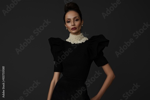 A woman in a black dress with a white collar and a pearl necklace. She is standing in front of a dark background