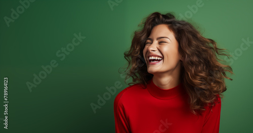 A woman in a bright red top laughs wholeheartedly against a deep green background, her hair tousled playfully.
