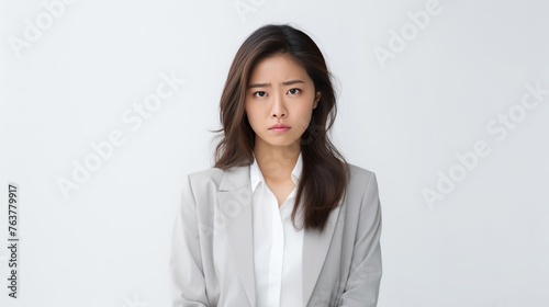 A woman in a business suit is looking down and it is upset
