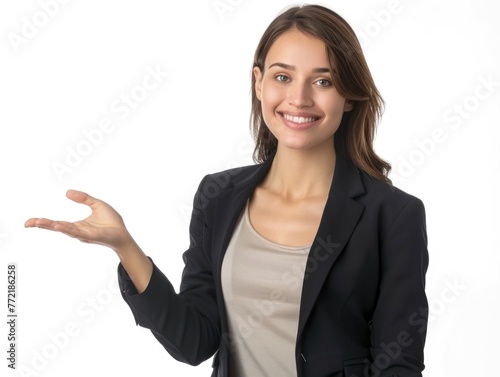 A woman in a business suit is smiling and holding her hand up, as if to point something out