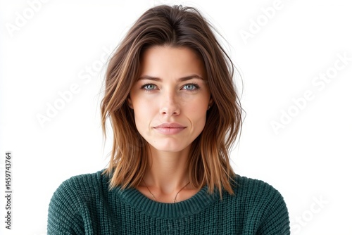 A woman in a green sweater is looking at the camera