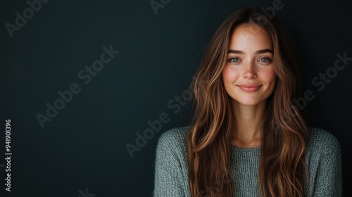 A woman in a green sweater smiling warmly, posing against a dark backdrop, capturing a moment of genuine happiness and contentment, and embracing a serene and peaceful demeanor.