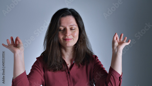 A woman in a red shirt raises her hands, eyes closed, conveying a sense of peace and mindfulness.