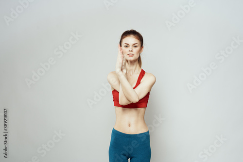 A woman in a red T-shirt on a light background is engaged in fitness gestures with her hands a slim figure
