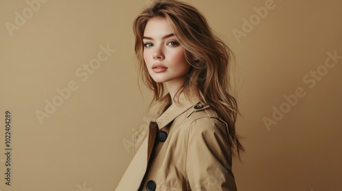 A Woman in a Tan Trench Coat with Wavy Brown Hair