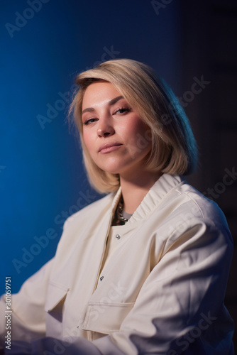A woman in a white jacket smiles for the camera in formal wear