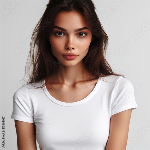 A woman in a white t shirt mockup picture s realistic attractive.