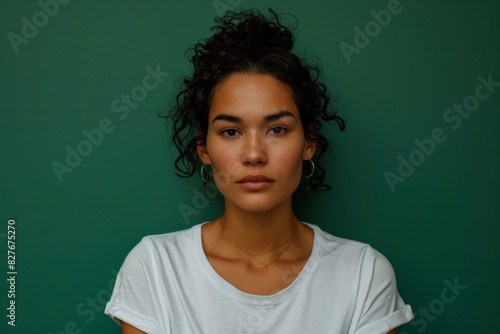 a woman in a white t-shirt stands in front of a green colorbackground, AI-generated