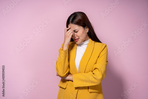 A woman in a yellow jacket is crying