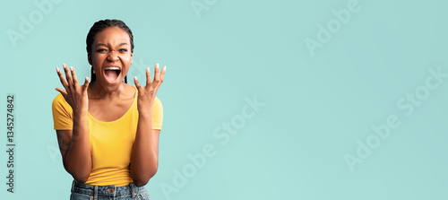 A woman in a yellow shirt smiles widely, raising her hands in delight. She showcases her enthusiasm and carefree spirit against a bright blue backdrop, creating a vibrant atmosphere.