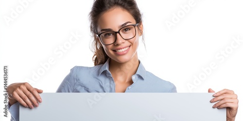 A woman is holding a white sign and smiling. The sign is blank, but it could be used to convey a message or idea. The woman's smile suggests that she is happy