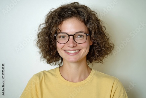 A woman is pictured wearing glasses and a yellow shirt