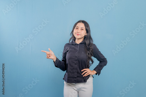 A woman is pointing at something with her finger. She is wearing a black shirt and white pants. She is smile and happy