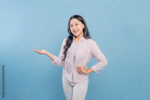 A woman is posing for a picture with her hands up in the air. She is wearing a pink shirt and white pants. Concept of confidence and positivity