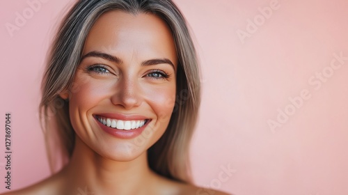 A woman is smiling joyfully against a soft pink backdrop, showcasing her radiant beauty and bright personality during daylight