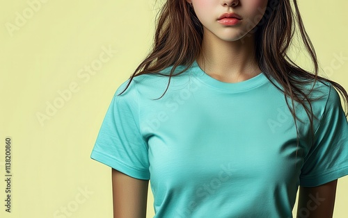 A woman is wearing a green blank shirt for design