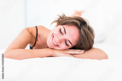 A woman lying at the end of the bed underneath the quilt and smiling, with her head resting upon her hand.