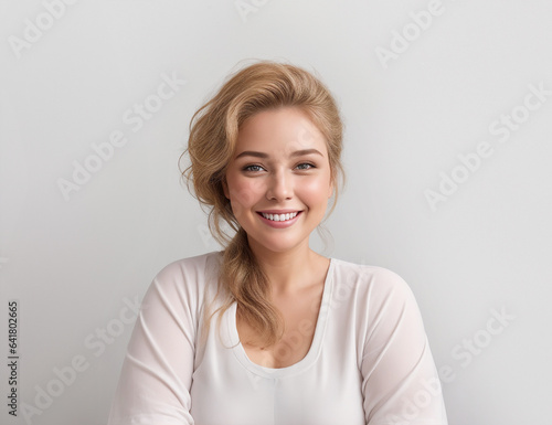 A woman on white background for advertisement. Copy space. She is smiling with a laugh. Help for dentist, office, HR, web assistant, online support. Positive and confident saleswoman or businesswoman.