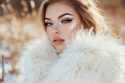 A woman poses wearing a luxurious fur coat, suitable for editorial or commercial use