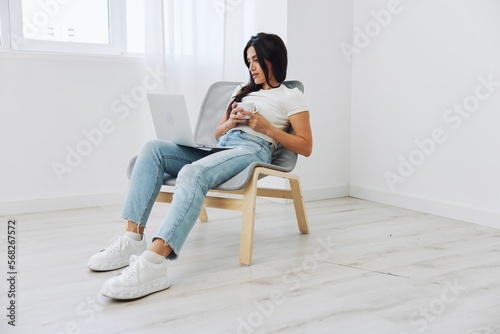 A woman relaxing at home sitting on a chair and playing games on her laptop, a smile of happiness and the joy of victory