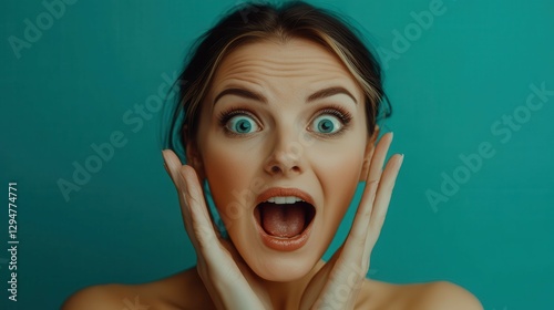 A woman showcases her surprise with wide-open eyes and a mouth agape. She holds her cheeks in disbelief, set against a vibrant teal background. Her expression is intense and engaging