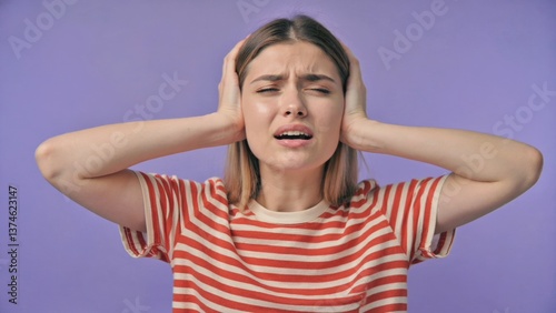 A woman sitting with her hands on her head, looking concerned or frustrated