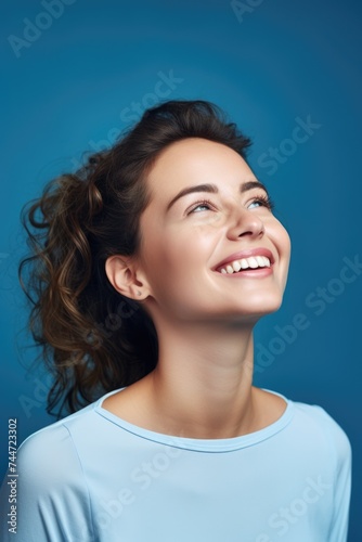 A woman smiling and gazing upwards. Suitable for inspirational concepts