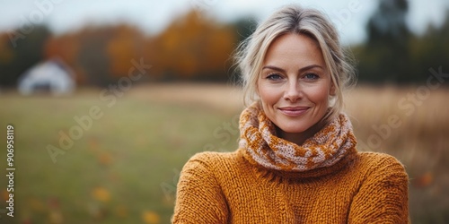 A woman stands in an autumn field wearing a warm sweater, smiling amid colorful foliage
