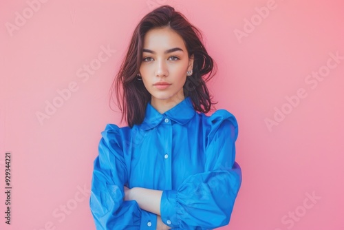 A woman wearing a blue shirt poses for the camera, with a calm and relaxed expression
