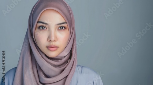 A Woman Wearing a Purple Hijab Looks Directly at the Camera