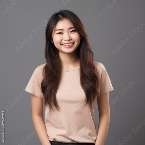 A woman wearing a tan shirt is joyfully smiling for the camera
