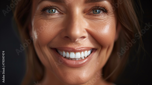 A woman with a big smile on her face. She has a lot of teeth and her lips are pink. the face of a 50-year-old woman with a wide smile with teeth on a black background