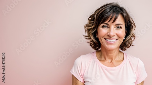 A woman with a pink shirt and brown hair is smiling. She is looking at the camera. Concept of happiness and positivity