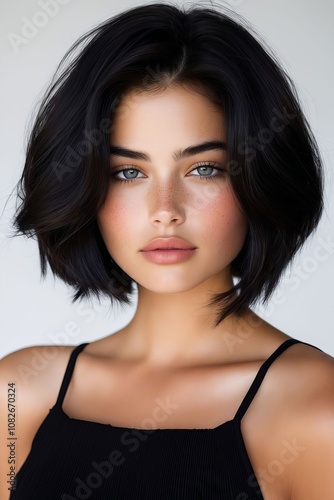 A woman with a short black bob with freckles on her face
