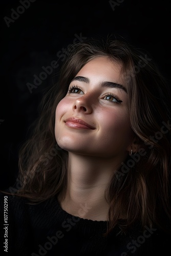 A woman with a smile on her face and black background