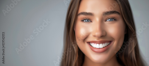 A woman with a white smile and a pink lip. Concept of happiness and confidence. perfect smile with beautiful veneers on a 28 year old female model