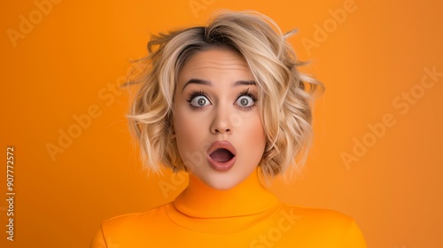 A woman with blonde hair and a surprised expression is wearing an orange sweater. The orange background adds a pop of color to the scene