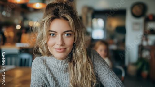 A woman with blonde hair and blue eyes is smiling at the camera. She is wearing a gray sweater and is sitting at a table