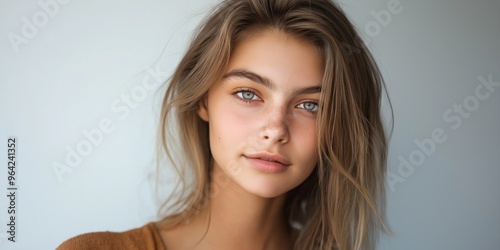 A woman with brown hair and a tan shirt is smiling at the camera. She has a light makeup look on her face