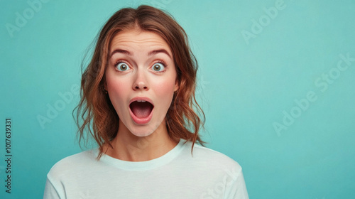 A woman with brown hair and red eyes is wearing a white shirt and looking surprised. The image has a bright and cheerful mood, as the woman's wide-eyed expression