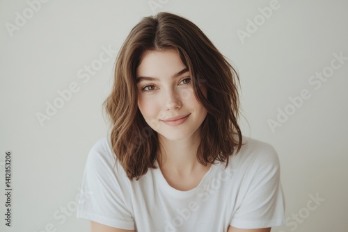 A woman with brown hair wearing a white t-shirt smiles at the camera.