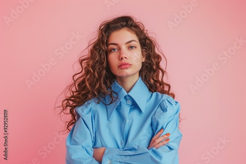 A woman with curly hair and a blue shirt, posing in a casual setting