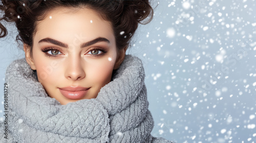 A woman with curly hair and bright eyes, wrapped in a thick gray scarf, smiles as snow falls around her. Beauty and winter