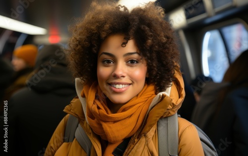 A woman with curly hair is smiling and wearing a scarf and a jacket. She is standing in a crowded subway car