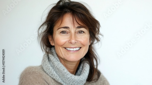 A woman with dark brown hair smiles warmly at the camera. Her brown sweater and the soft lighting create a cozy and inviting atmosphere.