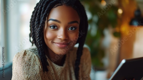 A woman with dreadlocks sits in front of a tablet, focused on her digital activity